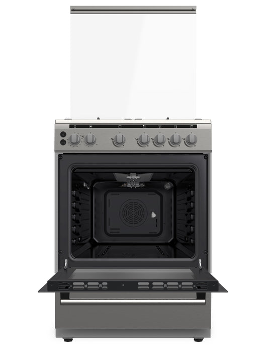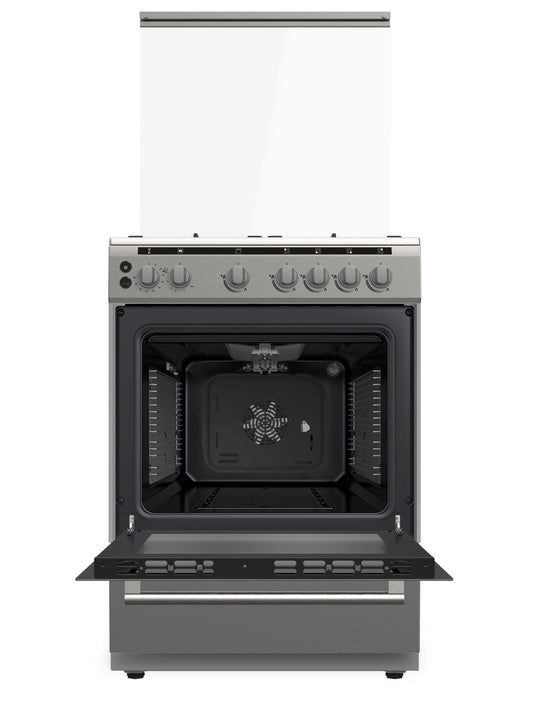 Daewoo Gas Cooker with Gas Oven 60cm, cast iron, 65 litre capacity, Full safety, Convection fan, Double ring burner, Self-cleaning, Sabaf Burner, Stainless steel, DGC-S664HF
